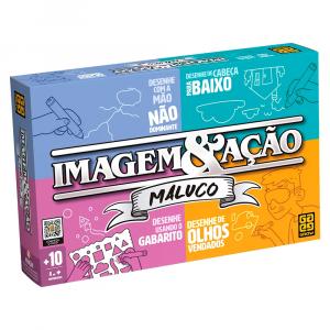 Prepare-se para a diversão! No Imagem & Ação Maluco, cada jogador terá sua vez de brilhar como desenhista ou mestre das mímicas, só que antes... deverá encarar um desafio sorteado no dado! É hora de soltar a imaginação, mas sem palavras ou gestos - só vale desenhar. Desafios como desenhar com a mão NÃO dominante, de olhos vendados, usando um gabarito, de cabeça para baixo, ou até mesmo tendo a sorte de seguir o jogando normalmente vão animar a competição. Com o prazo da ampulheta vencendo, será que seus colegas vão adivinhar a tempo?